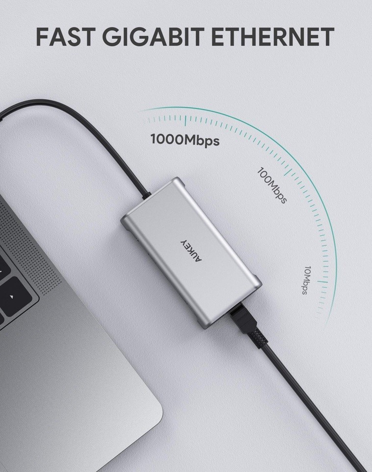 Aukey CB-C91 zapewnia prędkość przesyłania danych na poziomie 5 Gb/s, a dzięki HDMI wysyłanie rozdzielczości do 4K @ 30Hz na podłączony wyświetlacz nie będzie stanowiło żadnego problemu. Oprócz tego Port Gigabit Ethernet obsłuży prędkości sieci do nawet 1000 Mbps. Bez kłopotu naładujesz również ulubione urządzenia. Dzięki wykorzystaniu technologii Power Delivery Twój laptop może być zasilany mocą 100 W, nawet kiedy będziesz korzystać z innych funkcji koncentratora. Ładowanie jeszcze nigdy nie było tak szybkie z pewnością przyzwyczaisz się do tak wysokiego standardu pracy od pierwszego dnia, a Aukey CB-C91 stanie się dla Ciebie nieocenionym (i niezastąpionym!) wsparciem.