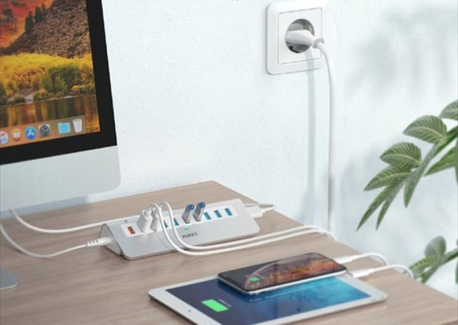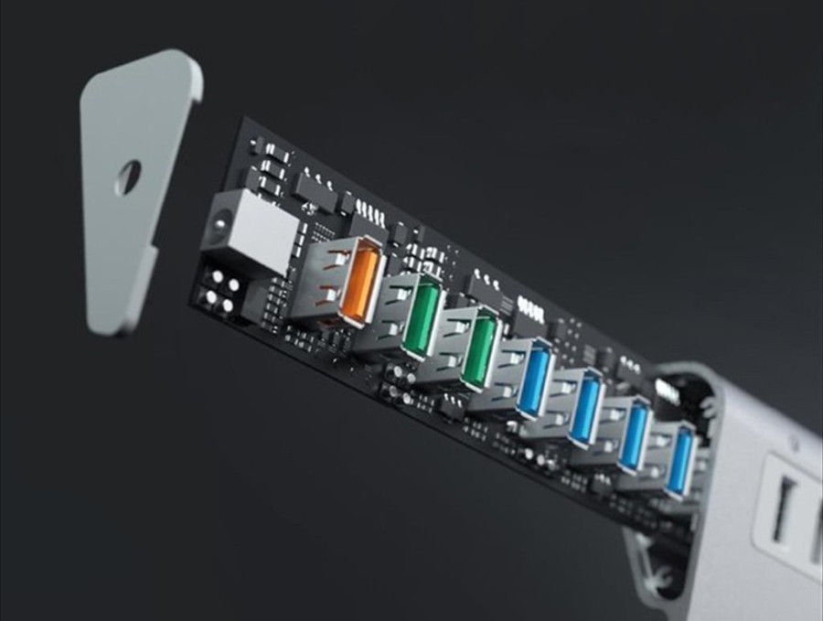 - 3 porty do ładowania urządzeń: Hub posiada wbudowane dedykowane 3 porty do ładowania urządzeń (2xUSB AiPower oraz 1xUSB Quick Charge 3.0)
