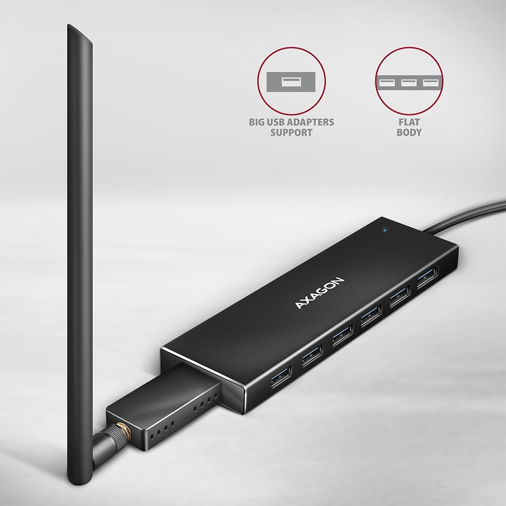 Hub slim USB 3.2 Gen 1 (USB 3.0) AXAGON HUE-F7A z kablem USB o długości 1 m łatwo i szybko podłączy do komputera do siedmiu urządzeń USB jednocześnie. Dzięki szybkiemu interfejsowi USB 3.2 Gen 1 transfer jest obsługiwany z prędkością do 5Gb/s.