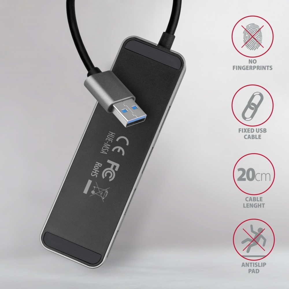 Metalowa obudowa huba jest wykonana z aluminium i zapewnia doskonałą ochronę mechaniczną przy częstym noszeniu. Elegancka powierzchnia obudowy o drobnej strukturze chroni przed pozostającymi odciskami palców. Gumowe podkładki zapobiegają ślizganiu się po stole Kabel USB o długości 20 cm zamocowany na stałe jest idealny dla użytkowników urządzeń mobilnych.