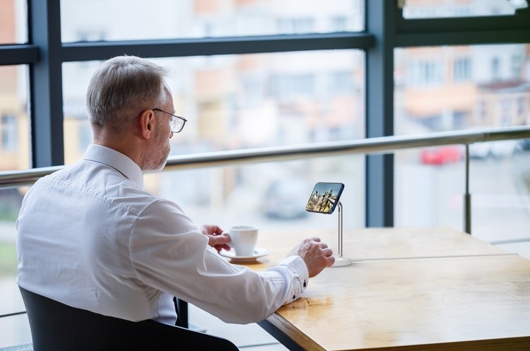 Dostosuj podstawkę, aby znaleźć idealny kąt oglądania filmów lub wiadomości. Ładuj w pionie lub w poziomie, aby uzyskać pełny obraz podczas włączania telefonu.