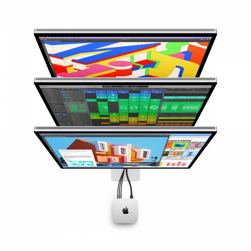 Mac mini doskonale współpracuje z monitorem Studio Display, klawiaturą Magic Keyboard i myszą Magic Mouse. Do tego jest gotowy do działania z innymi wyświetlaczami i akcesoriami, których używasz. Po prostu miksuj, paruj i stwórz Maca mini dla siebie.