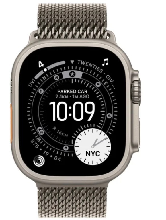 - Apple Watch Ultra 3 z kopertą z tytanu w kolorze naturalnym, widać mapy offline i kolejne wskazówki, zegarek ma opaskę Alpine w kolorze terakoty