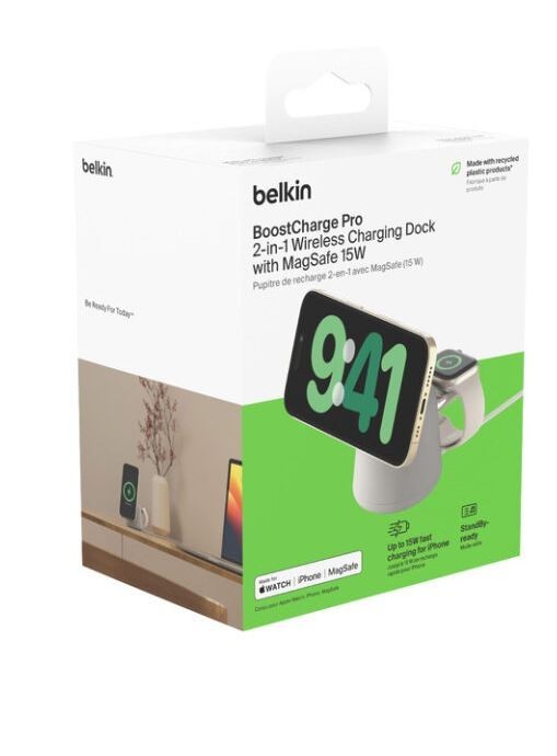 Akcesoria w zestawie: Bezprzewodowa stacja ładująca 2 w 1 z Magsafe 15 W Wbudowany kabel USB-C o długości 1,5 m Zasilacz USB-C o mocy 30 W