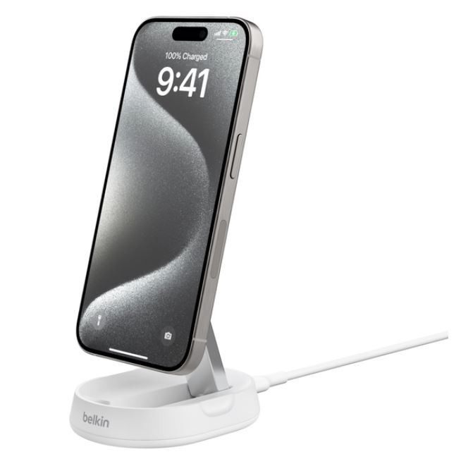 Szybko ładuj iPhone'a lub inne urządzenie kompatybilne z Qi2 mocą do 15 W. Technologia Qi2 optymalizuje zużycie energii i chroni żywotność baterii urządzenia. Użyj regulowanego pochylenia w trybie podkładki lub stojaka. Użytkownicy Apple mogą skorzystać z kompatybilności w trybie gotowości.